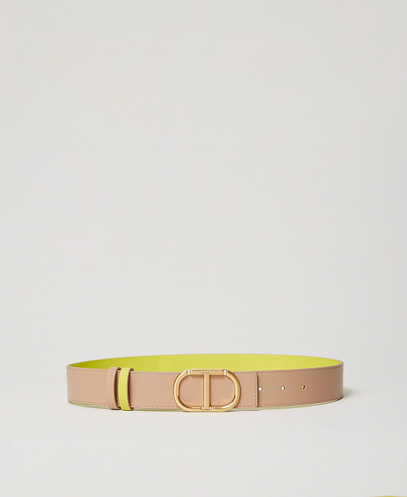 Двусторонний кожаный ремень низкой посадки с металлической пряжкой и двумя шлевками разных цветов.